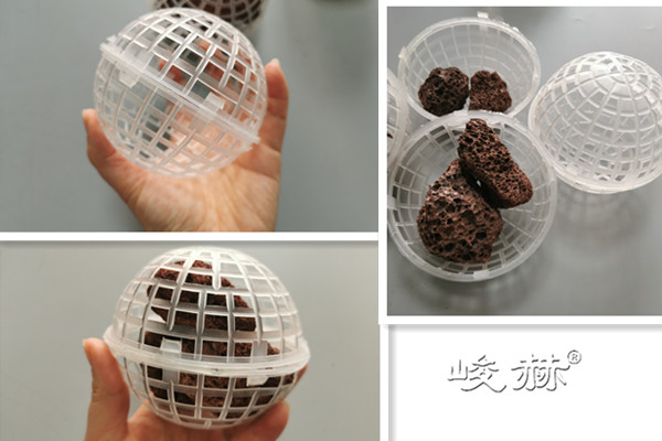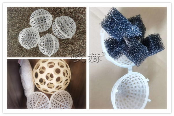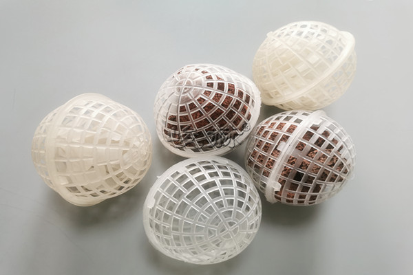 該填料系列由具有耐腐、耐溫、耐老化、高強(qiáng)度的高分子聚合物注塑而成,分內(nèi)外雙層球體,外部為中空魚網(wǎng)狀球體,內(nèi)部特殊工藝制成的彈性毛絲單體組合而成。主要起生物膜載體的作用,同時(shí)兼有截留懸浮物的作用,具有生物附著力強(qiáng)、比表面積大、孔隙率高、化學(xué)和生物穩(wěn)定性好、經(jīng)久耐用、不溶出有害物、 不引起二次污染、防紫外線、抗老化、親水性能強(qiáng),阻力小,布水、布?xì)庑阅芎?,又有功割氣泡作用等特點(diǎn),在使用時(shí)直接投入水中,在水里似沉非沉,能全方位自由活動(dòng),無死區(qū)??梢曀|(zhì)濃高低和水量的增減,填料可多可少。實(shí)際投放量為池體積的30%-70%,進(jìn)出口需用格網(wǎng)攔住,以免隨水漂走。