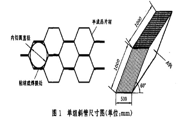 3.2? ?塑料斜管產品分為半成品和成品,塑料斜管半成品是指經機械熱壓而成型的連續(xù)半六邊形片材,其成品是將半成品經焊接或粘結而成的具有一定傾斜角度的組件。規(guī)定成品單組斜管的尺寸為長(l)1000 mm,寬(b)500 mm,斜長(L)1000 mm,傾角60°,見圖1。
